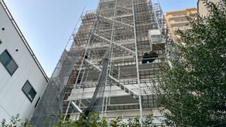 足場工事足場は高層階に近づいてきました。回数が高くなると、足場部材を持ち上げるEVで上げるので低層階より組むのに時間がかかります。シーリング撤去古いコーキング材の撤去が順調に進んでおります。急な気温の…