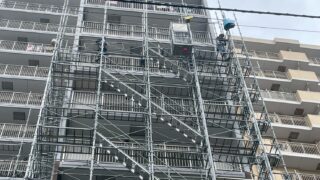 長尺シート工事シートを剥がしてる様子です。足場工事高層階の設置の様子です。メッシュシートが入り、工事足場らしくなっていきます。