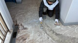 長尺シート工事階段の長尺シートを剥がしていきます。見た目は綺麗ですが年数分の劣化をしているので、硬くなっておりました。足場工事高層階の足場工事です。下地調査タイルの浮いている場所やひび割れなどを一枚一…
