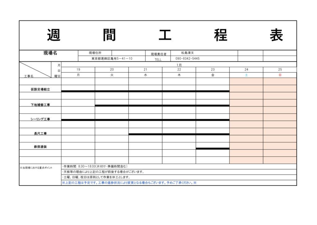 | 内容 | 仮設足場組立 下地補修工事 シーリング工事 長尺工事 鉄部塗装 |