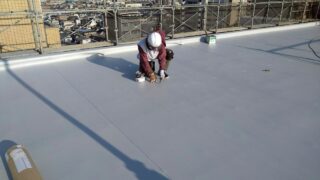 塩ビシート防水工事機械固定のディスクの上にシートを貼ってる様子です。タイル工事タイルの貼ってる様子です。ウレタン塗膜防水仕上げに長尺シートを貼りますが、その前に隅の部分をウレタン塗膜防水で処理します。…