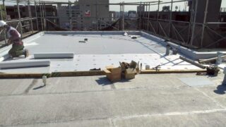 タイルの補修工事張り替えたタイルの上から目地処理をしている様子です。屋上防水工事塩ビシートの施工の様子です。サンクレイドル亀有の既存の防水層はアスファルト防水でした。アスファルト防水の修繕工事は、上か…