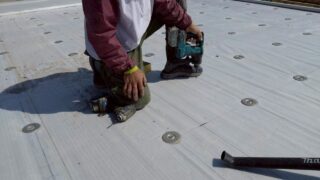 鉄部塗装各種塗装工事が進んでおります。塩ビシート防水工事シートを接着してる様子です。塩ビシートの処理は機械固定と言って最初にディスクを建物に打ち込みその上からこのシートを固定させております。