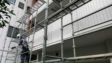 長尺シート工事シートを剥がしてる様子です。足場工事高層階の設置の様子です。メッシュシートが入り、工事足場らしくなっていきます。
