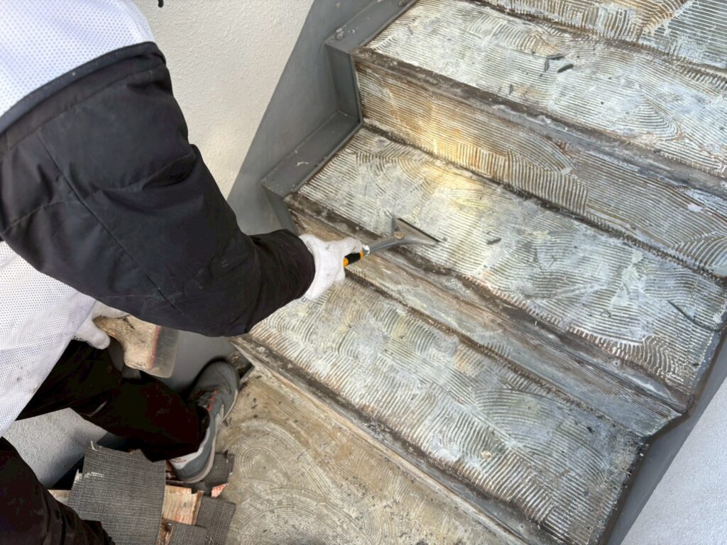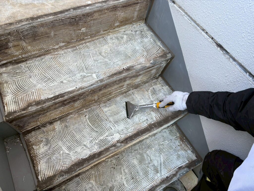 1/22 長尺シート工事 工事情報 2026.01.22 目次 長尺シート工事足場工事 長尺シート工事 シートを剥がしてる様子です。 足場工事 高層階の設置の様子です。メッシュシートが入り、工事足場らしくなっていきます。
