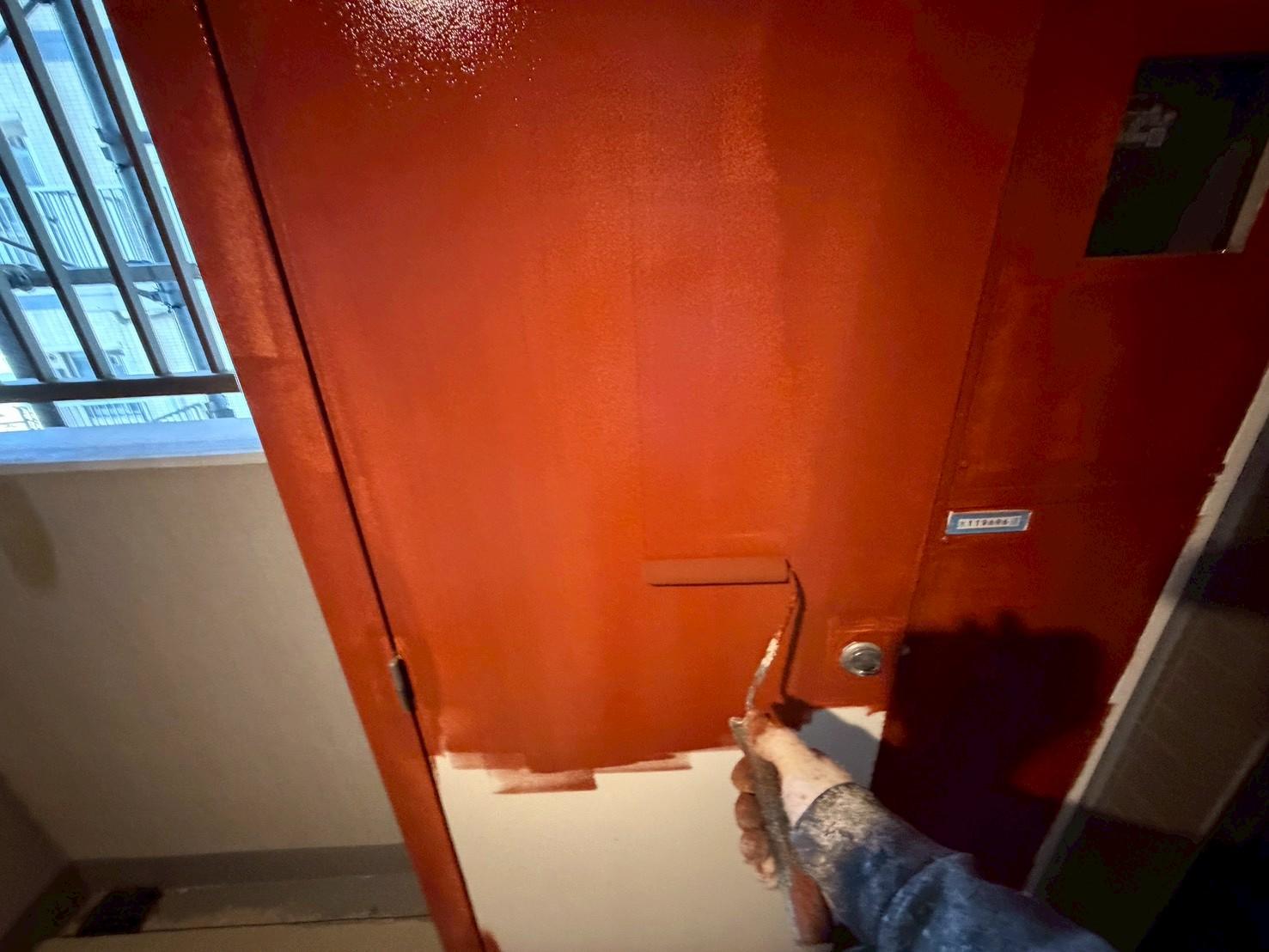 錆止め塗料を塗っております。鉄部塗装工事で一番大事な作業は、錆を綺麗に落とすケレン作業と、この錆止め作業です。ここが一番大事な作業です。