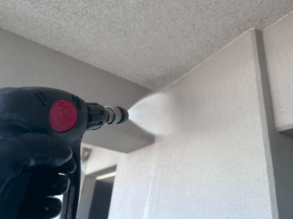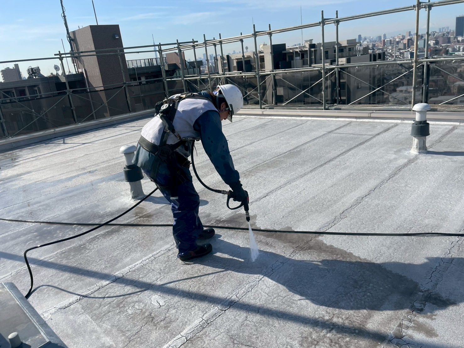 2月10日 洗浄工事 工事情報 2026.02.102026.02.12 目次 洗浄工事下地調査長尺工事 洗浄工事 汚れを落としていきます。お化粧をする前の洗顔のような役目があり、どんなに良い材料を使っても元が汚れてたら材料が長期的につかなくなります。そのため、まずは綺麗に洗い流します。 下地調査 下地調査は写真のように専用の工具で音を出しながら浮いている状態などを探ります。 長尺工事 古いシートを剥がしていきます。